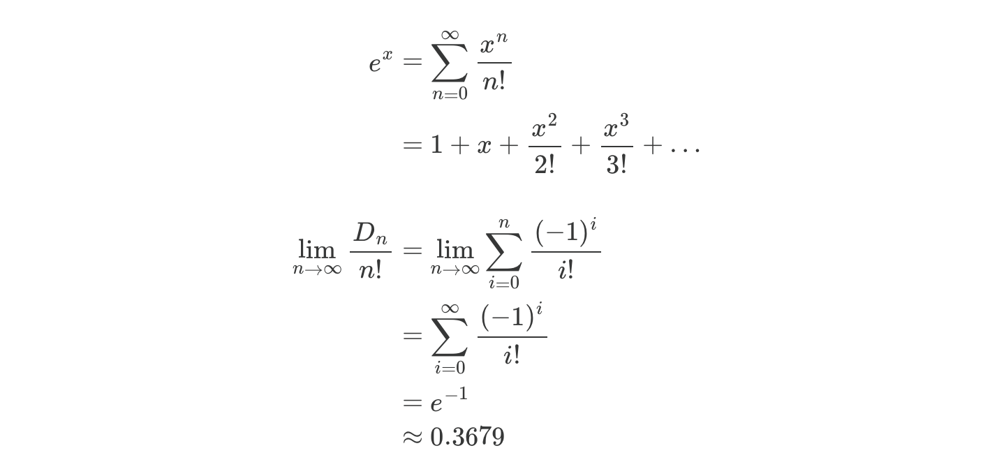 Interestingly, the percentage of “zero correct” permutations converges to ~36.79%. Why?