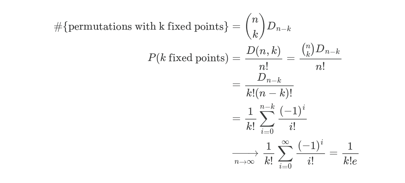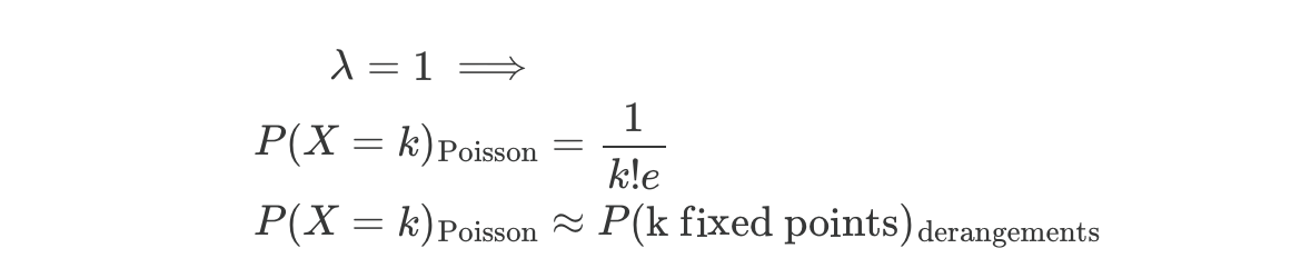 Substituting for λ the expected number of fixed points, which in this case is E[fixed points] = P(any given point being fixed) * n = 1/n * n = 1, the Poisson and derangement formulas converge! In other words, probability of a permutation with k fixed points converges to the Poisson distribution.