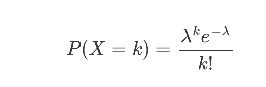Common examples: number of emails per hour, radioactive decays per second, typos per page. The Poisson distribution counts those events. It has a single parameter λ, the expected number of events in an interval. The probability of exactly k events is: