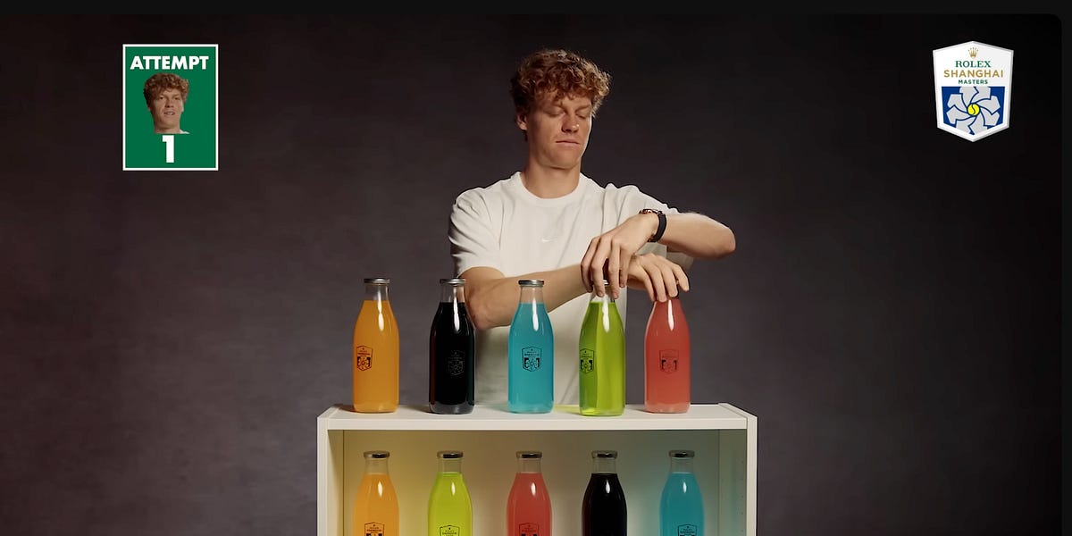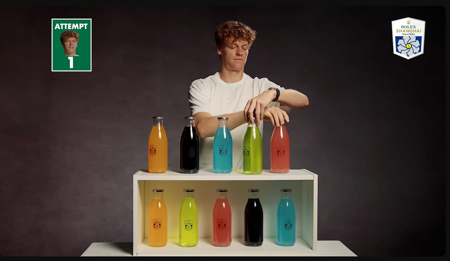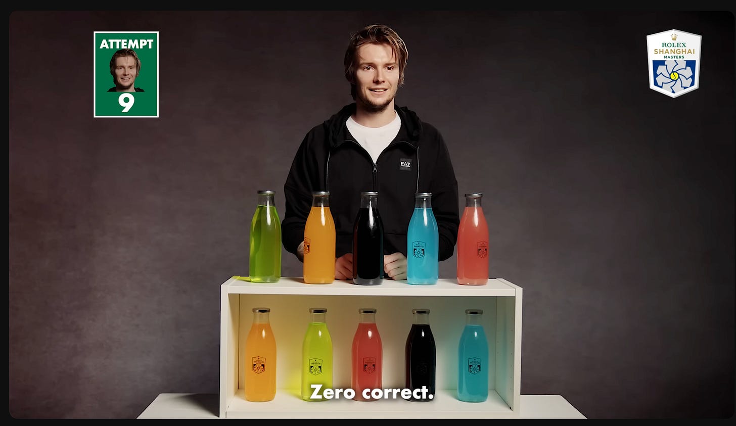 TennisTV, in some underrated Shanghai Masters promo content, had professional players attempt a “bottle challenge”. Five bottles of different colors are lined up in front of you. The same five colors are hidden below them in some unknown order. Your job is simple: match each top bottle with the identically colored one beneath it. After every move, usually swapping two bottles, you’re told how many positions are currently correct.