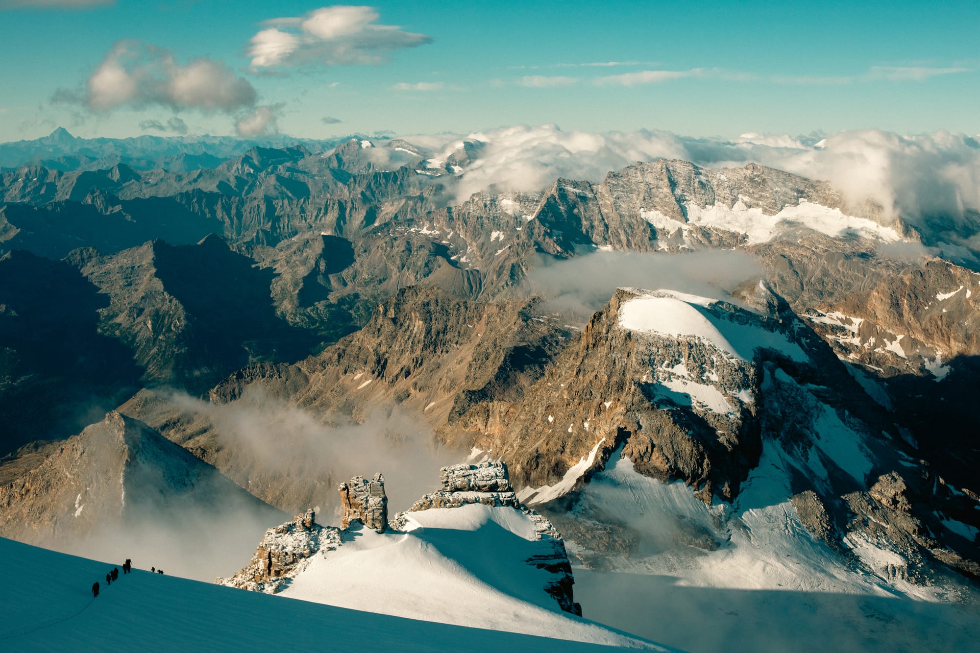 I could feel the steel of the ice axe in my hand acting as a radiator, sucking any remaining warmth in my fingers out through my gloves, and dissipating it into the thin atmosphere around me. And yet this tool turning my fingers purple was the key anchor keeping me locked into the track that wound up the face of Gran Paradiso, Italy’s tallest peak. I looked down below me and saw the European Alps laid out into the distance, and a line of climbing crews snaking their way up the face towards me.