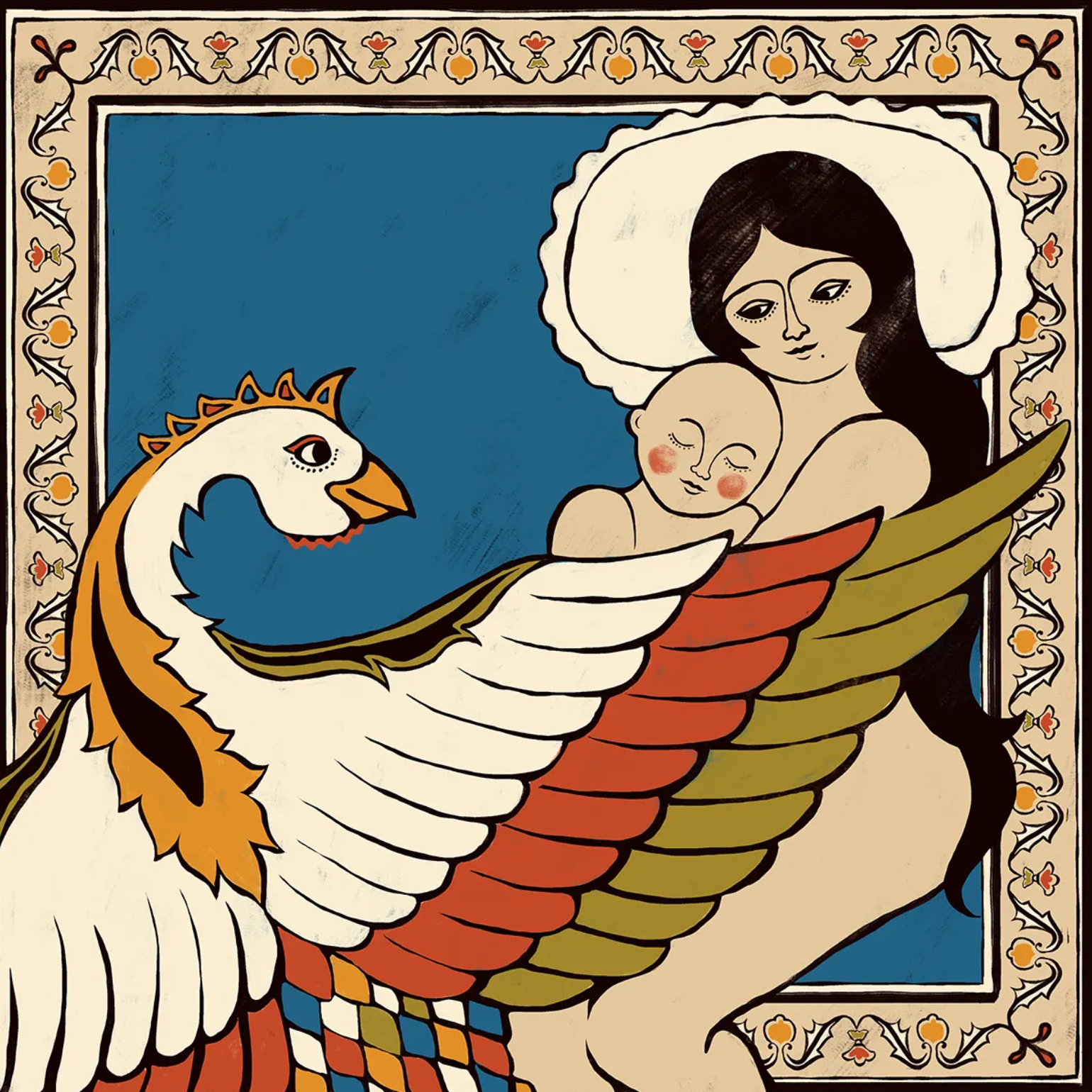 The Simurgh is a benevolent, ancient bird in Persian and Iranian mythology. Simurgh is often shown as a majestic, wise being symbolizing the union of Earth and sky. The Simurgh’s most famous role in the Shahnameh (The Book of Kings) is her relationship with Prince Zal. Zal was abandoned on Mount Alborz, where the compassionate Simurgh rescued and raised him, teaching him wisdom and giving him three golden feathers to summon her aid. Years later, when Zal’s wife Rudaba nearly died during the difficult birth of their son Rostam, he burned a feather and the Simurgh appeared, guiding to perform a Rostamzad - a life-saving Caesarean section.
